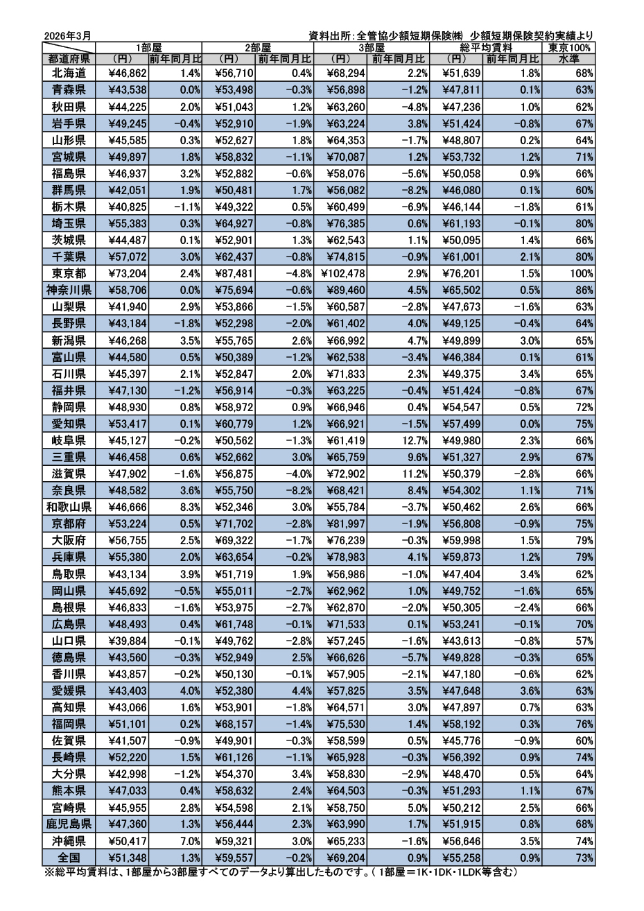全国家賃動向 全国平均家賃による間取り別賃料の推移 全国賃貸管理ビジネス協会では、定期的に全国の家賃動向を調査しています。 2026年3月調査 契約ベースによる統計につき、一般的な募集賃料ベースの統計よりも、資料は下回っています。 全国家賃動向一覧へ戻る